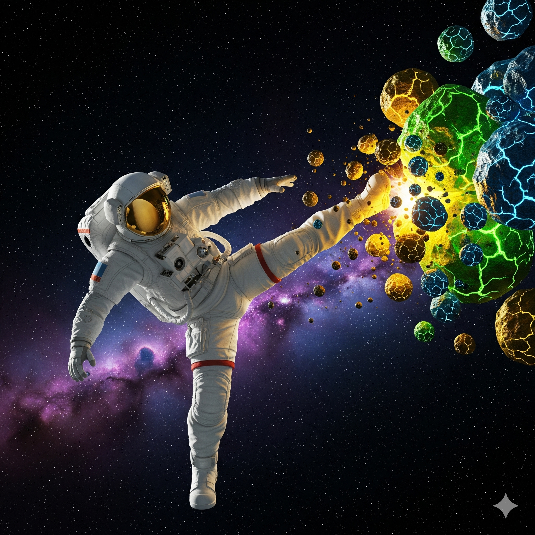 Now, floating in the dark expanse of space, W survival depends on his unwavering precision. He has to time his kicks perfectly to deflect the relentless barrage of asteroids. Each successful strike sends the space rock spiraling away into the void, a fiery explosion marking its destruction. The fate of humanity rests on his shoulders, or rather, on his foot. With every kick, he’s not just breaking rocks; he’s protecting the people of Earth, one powerful, well-aimed roundhouse at a time.